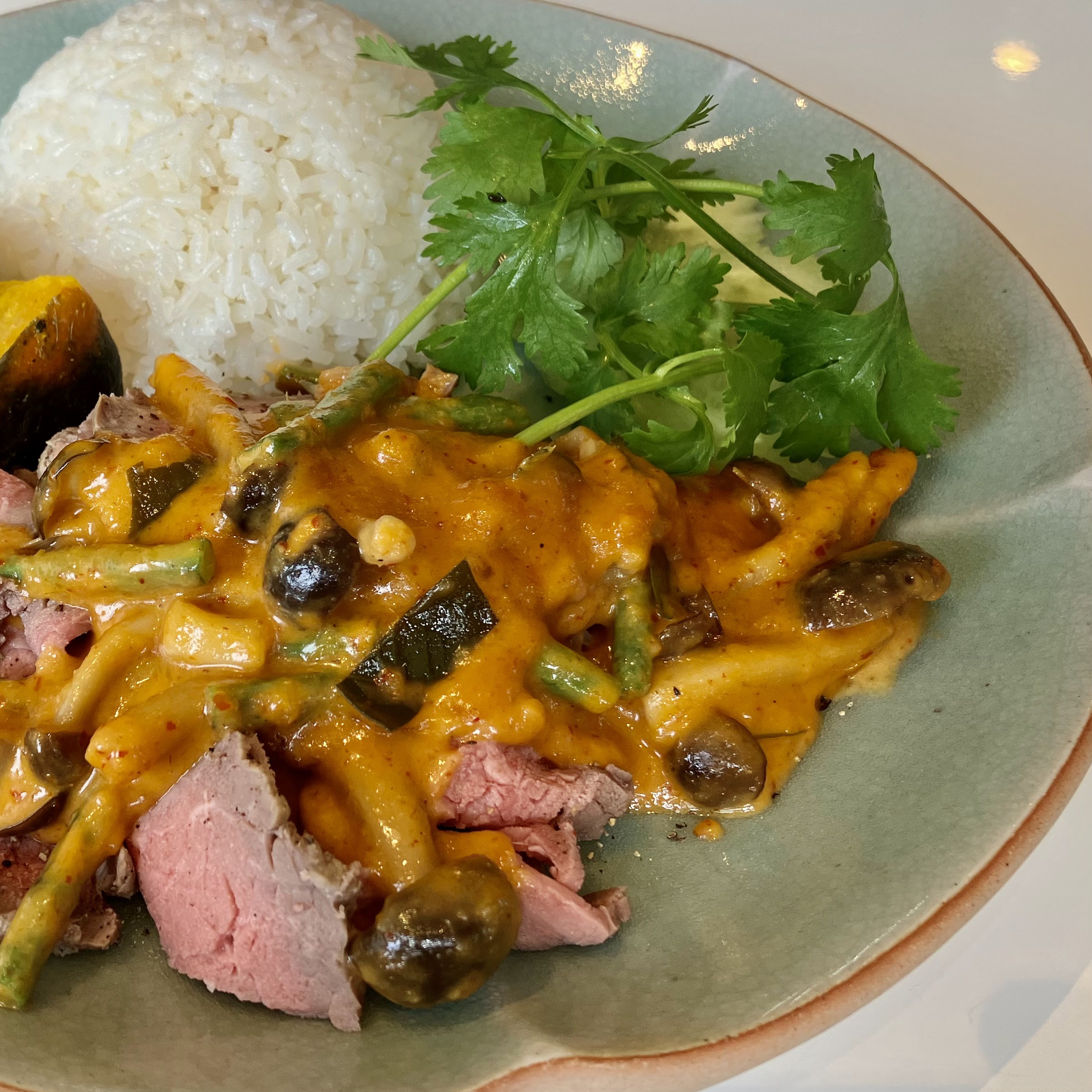 USAビーフ赤身のヘルシーなローストビーフに人気のいんげんときのこのレッドカレーソースを合わせました。