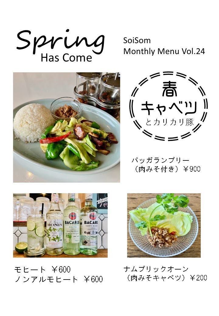 2023年4月のマンスリーメニューは春キャベツとムーグローブ(かりかり豚)の炒め物です。